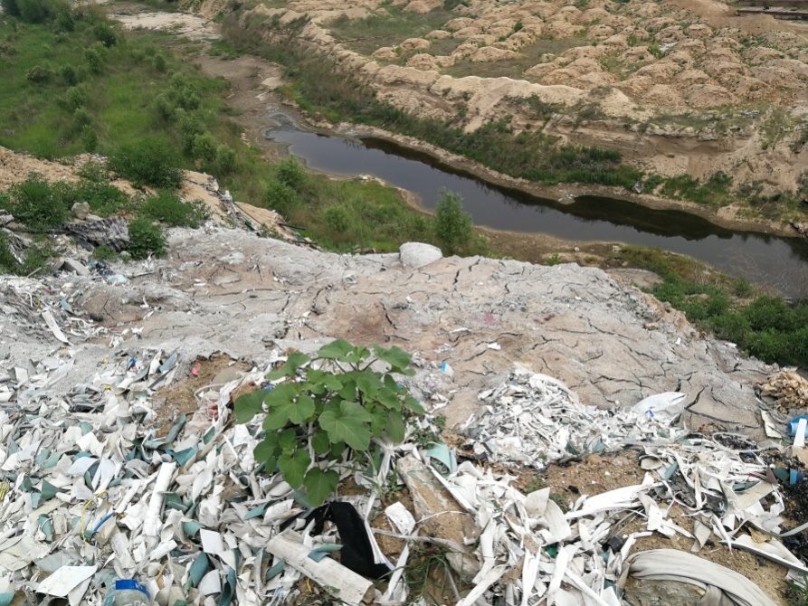 现场检查发现,在大沙河定州段远远望去,河堤上堆满了生活垃圾、工业废渣、边角料、医疗废物等多种固体废物,各种垃圾“应有尽有”,形成了一个长约3公里的“垃圾带”。与长度同样惊人的,是“垃圾带”的宽度,垃圾一直从河堤延伸至河床上,斜坡高度达到10米左右。