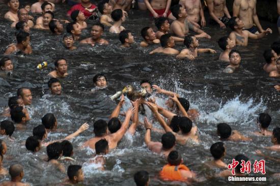 6月18日,正值端午佳节,湖南凤凰古城沱江河上一年一度的抢鸭子习俗吸引了数万游人围观。杨华峰 摄