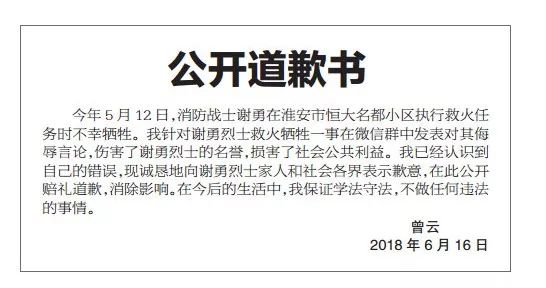 “今年5月12日,消防战士谢勇在淮安市恒大名都小区执行救火任务时不幸牺牲。我针对谢勇烈士救火牺牲一事在微信群中发表对其侮辱言论,伤害了谢勇烈士的名誉,损害了社会公共利益。我已经认识到自己的错误,现诚恳地向谢勇烈士家人和社会各界表示歉意,在此公开赔礼道歉,消除影响。在今后的生活中,我保证学法守法,不做任何违法的事情。”