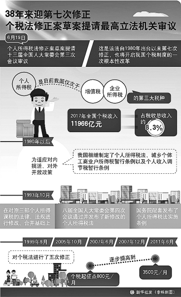 备受关注的个人所得税法修正案草案19日提请十三届全国人大常委会第三次会议审议,这是个税法自1980年出台以来第七次大修,也将迎来一次根本性变革:工资薪金、劳务报酬、稿酬和特许权使用费等四项劳动性所得首次实行综合征税;个税起征点由每月3500元提高至5000元;首次增加子女教育支出、继续教育支出、大病医疗支出、住房贷款利息和住房租金等专项附加扣除;优化调整税率结构,扩大较低档税率级距……