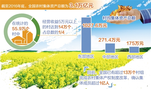 韩俊表示,清产核资是农村集体产权制度改革的第一场硬仗。我国农村集体资产可谓数量庞大。根据农业农村部的统计,截至2016年底,全国农村集体资产总额为3.1万亿元(不包括土地等资源性资产)。在统计的55.9万个村中,经营收益5万元以上的村达到14万个,占总数的四分之一。东部地区村均集体资产总额1027.6万元,中部地区村均271.4万元,西部地区村均175万元。