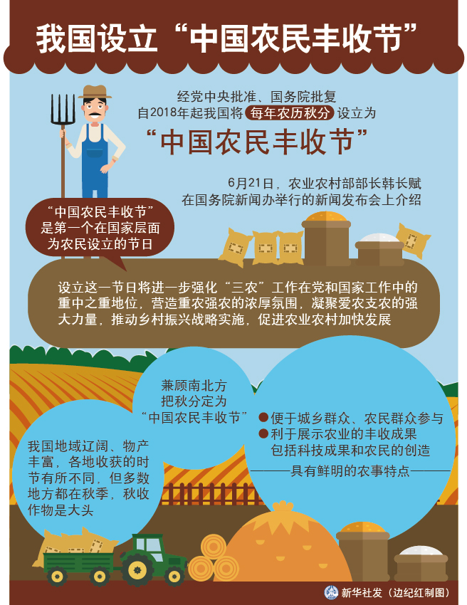 经党中央批准、国务院批复,自2018年起我国将每年农历秋分设立为“中国农民丰收节”。“中国农民丰收节”是第一个在国家层面为农民设立的节日。设立这一节日将进一步强化“三农”工作在党和国家工作中的重中之重地位,营造重农强农的浓厚氛围,凝聚爱农支农的强大力量,推动乡村振兴战略实施,促进农业农村加快发展。