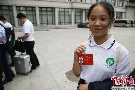 6月24日,北京,河南省代表团的小团员冯佳音展示刚刚领到的出席证。中国青年报·中青在线记者 陈剑/摄