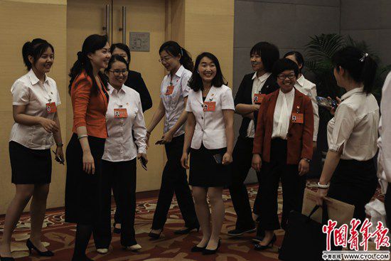6月24日,北京,参加共青团十八大的中央企业代表团代表报到后,准备合影留念。中国青年报·中青在线记者 赵迪/摄