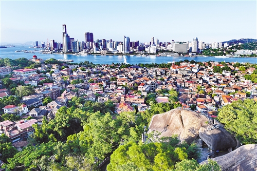 从鼓浪屿远望厦门岛(2017年8月31日摄)。当中国改革开放的航船扬帆出港,历史的坐标就将其定位为中国最早设立的四个经济特区之一。 新华社记者 张国俊摄