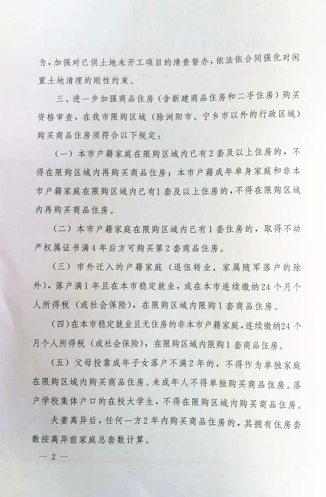 根据《通知》,长沙房地产市场将从项目监管、土地出让、购房资格、户籍管理、严禁炒作等方面进行全面调控,规定本市户籍家庭在限购区域内已有1套住房的,取得不动产权属证书满4年后方可购买第2套商品住房;市外迁入的户籍家庭(退伍转业、家属随军落户的除外),落户满1年且在本市稳定就业,或在本市连续缴纳24个月个人所得税(或社会保险),在限购区域内限购1套商品住房。