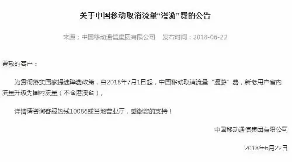 6月22日,中国移动、中国联通和中国电信先后宣布自7月1日起取消流量“漫游”费,手机用户省内流量升级为国内流量(不含港澳台)。