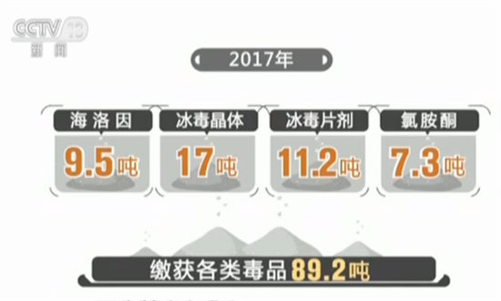2017年,全国共破获毒品刑事案件14万起,抓获毒品犯罪嫌疑人16.9万名,缴获各类毒品89.2吨,其中海洛因9.5吨、冰毒晶体17吨、冰毒片剂11.2吨、氯胺酮7.3吨。