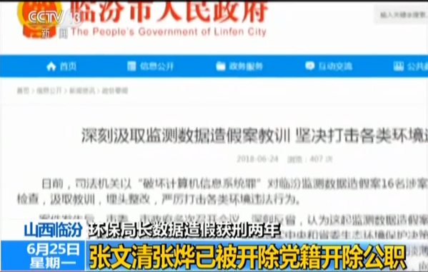 就在昨天(24日),临汾市人民政府通过其官方网站发布公告称,5月27日,已对涉案人员市环保局原局长张文清、市环保局办公室原负责人张烨2人作出开除党籍、开除公职的处理;对市环境监测站原聘用人员张永鹏、李皇涛2人解除劳务合同。