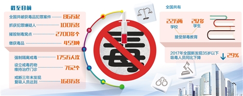 党的十八大以来,我国全面落实中共中央、国务院《关于加强禁毒工作的意见》,推动禁毒工作取得了历史性成就。截至目前,全国共破获毒品犯罪案件86万起,抓获犯罪嫌疑人100万名,摧毁制毒窝点2700多个,缴获毒品459吨;强制隔离戒毒175万人次,设立762个戒毒药物维持治疗门诊,戒断三年未发现复吸人员达到168万名;全国共有22万所学校2亿多学生接受禁毒教育,2017年全国新发现35岁以下吸毒人员同比下降29%。