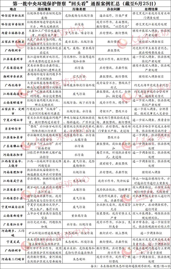 第一批中央环保督查“回头看”通报案例汇总(截至6月25日)。(制图/陈心茹)
