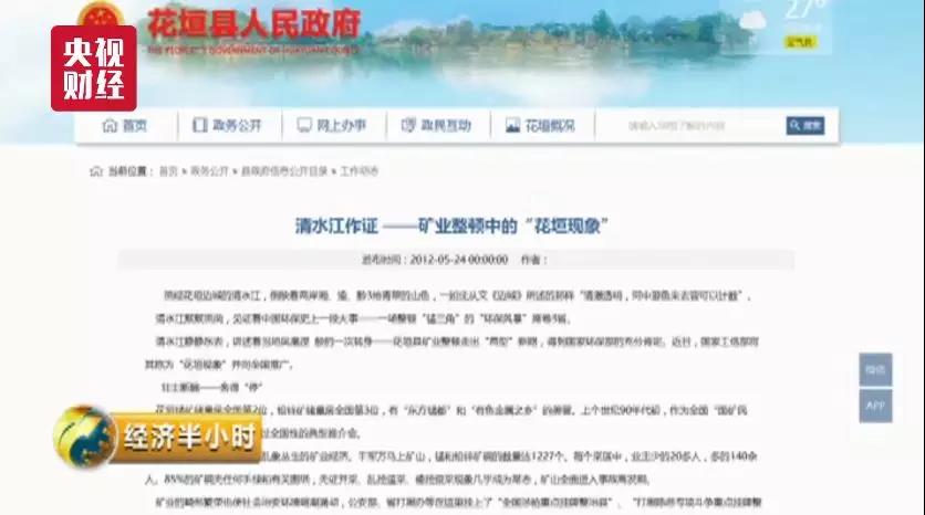 在花垣县政府的官方网站上,记者看到了花垣县2017年的《政府工作报告》。报告指出:国家环保督察交办的突出环境问题基本完成整治,完成12个重金属污染治理项目和21座尾矿库环保治理,尾矿库较大污染隐患基本消除。