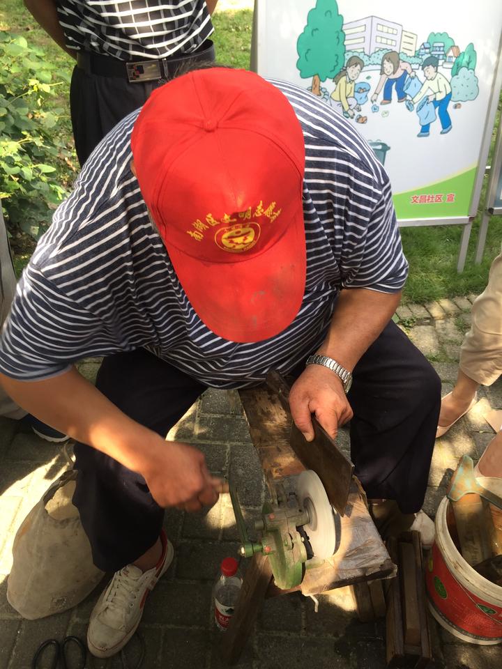 磨刀是技术活,也是体力活。骄阳似火,老谢的脸上很快结满了大大小小的汗珠,横条纹T恤已经湿透,但不管是居民递来剪刀还是菜刀,他来者不拒,干劲十足。前些年,96345党员志愿者总站南湖街道分站给他的设备“升了级”,配备了电动磨刀装备,“但我喜欢用手磨,更有感觉也能磨得更好。”老谢对自己的手艺很自信,之前还曾创造一天磨96把剪刀的记录。每有居民感谢他,他总笑着说,“不用谢,我名字里已经有谢了。”