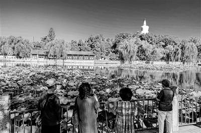 昨天上午,北青报记者在北海公园看到,8000平方米的荷花湖内,一朵朵荷花已经绽放,迎来盛花期。不少市民游客乘坐着摇橹船,在荷花荡中缓缓摇曳而行。此时此刻,荷花映照白塔、碧空映衬白云,眼前的风景美不胜收。