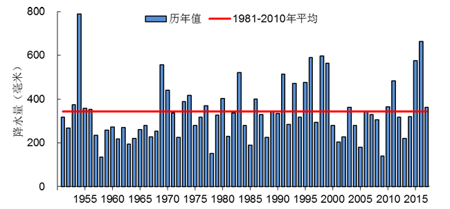 周兵:2018年华南前汛期于4月20日首先在广西开始,较常年(4月6日)偏晚14天,近60年广西首先开汛的年份只有5年:1963、1971、1990、1996和2018。3月到5月,华南地区的平均降水量较常年同期偏少36.9%,导致当地出现不同程度的气象干旱。而6月初,4号台风“艾云尼”3次登陆广东,带来了充沛的龙舟水,一定程度上缓解了旱情。