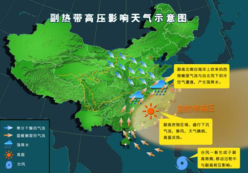 而气候系统在大气环流的异常主要表现在西太平洋副热带高压系统阶段性位置、强度的异常,目前为止我国总体未出现大范围持续性干旱或大江大河流域性洪涝,未出现持续性高温热浪或反复性寒流暴风雪事件。但进入汛期后区域性暴雨、干旱和高温事件时有发生,位置与传统的气候有所不同,雷雨大风强对流天气频发,天气气候出现了异常并造成一定范围的气象灾害,总体上与西太平洋副热带高压系统、低纬度印缅槽和中高纬度长波槽级活动相关联。