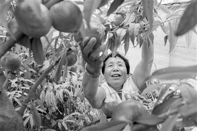 农民在山东省高青县田镇街道宁家村旧村复垦土地上收获油桃。新华社发(张维堂 摄)
