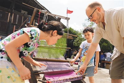 外国游客在湖南通道侗族自治县体验侗锦制作。吴三东摄(人民图片)
