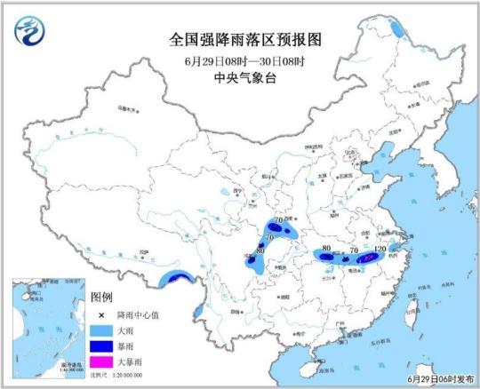 中央气象台6月29日06时发布暴雨蓝色预警:预计6月29日08时至30日08时,湖北南部、江西北部、安徽南部、浙江北部、四川盆地西部和北部、甘肃东南部、陕西西南部等地的部分地区有大雨或暴雨,局地大暴雨(100~120毫米);上述部分地区伴有短时强降水(最大小时降水量30~50毫米,局地70毫米以上),局地并伴有雷暴大风等强对流天气。