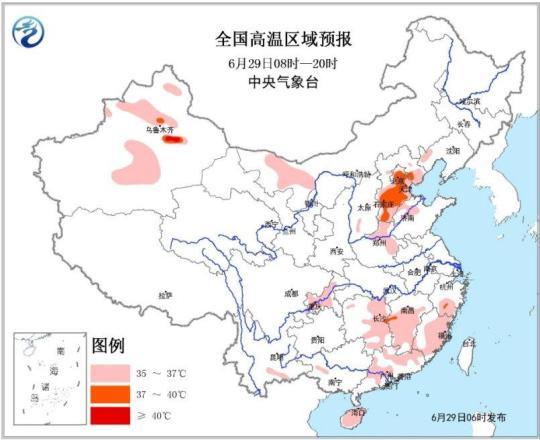 全国高温区域预报图(6月29日08时-20时)