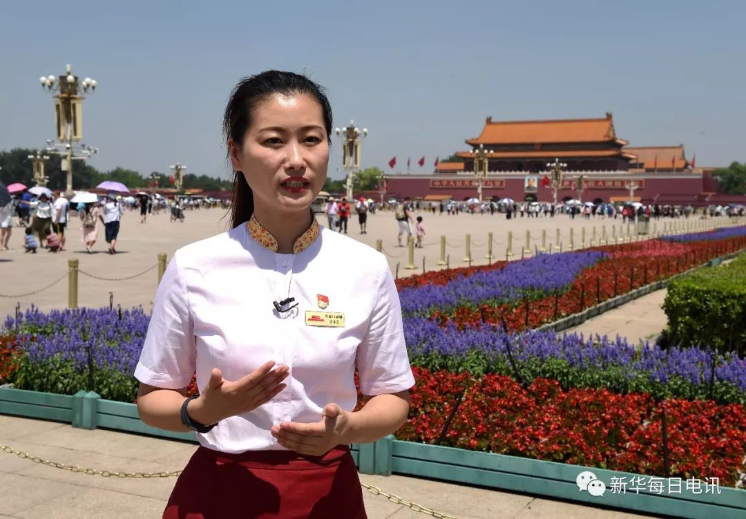 在天安门城楼工作了19年的刘阳讲述她的工作经历(6月21日摄)。新华每日电讯记者罗晓光 摄