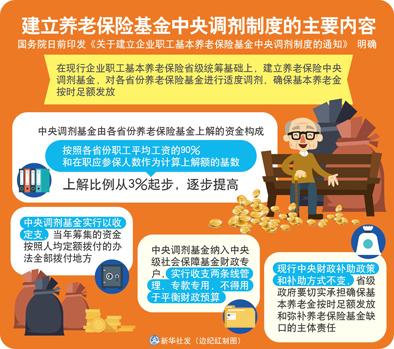 国务院日前印发《关于建立企业职工基本养老保险基金中央调剂制度的通知》(以下简称《通知》),决定建立养老保险基金中央调剂制度,自2018年7月1日起实施。