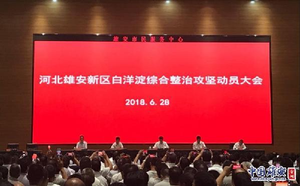 6月28日下午,雄安市民服务中心,1000多人参加河北雄安新区白洋淀综合整治攻坚动员大会,这是今年新区组织的第二次千人大会。河北省委常委、副省长,雄安新区党工委书记、管委会主任陈刚用这句话亮明了对白洋淀治理工作的坚定决心和意志。