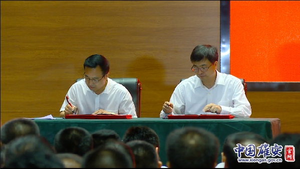河北省委常委、副省长,雄安新区党工委书记、管委会主任陈刚与三县负责人签署《纳污坑塘治理责任状》。记者马梦迪 摄