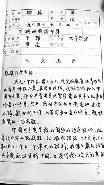 1990年4月26日,26岁的钟扬在入党志愿书中郑重写道: “我是一个在红旗下长大、受党教育培养多年的青年科技工作者。在学生时代,我就向往加入中国共产党。今天,我对中国共产党更加坚定不移。我愿为党工作,为革命事业奋斗终身。”