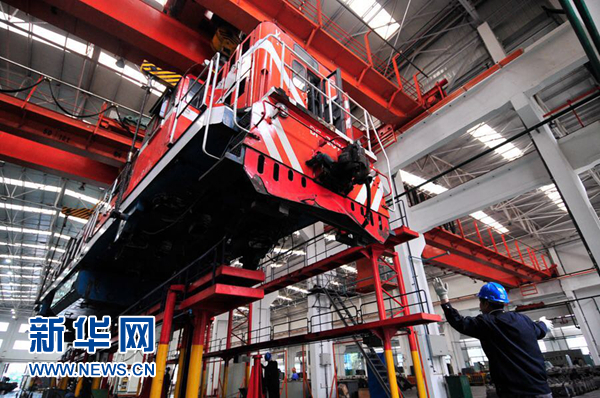 在中国铁路西安局集团有限公司宝鸡机车检修厂联合检修库内,职工们正紧锣密鼓地进行机车落车组装作业。