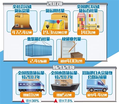 交通运输部副部长刘小明在会上表示,交通运输部制定了推进运输结构调整三年行动计划,目标到2020年实现全国铁路货运量较2017年增加11亿吨、增长30%,水路货运量较2017年增加5亿吨、增长7.5%,沿海港口大宗货物公路运输量减少4.4亿吨。