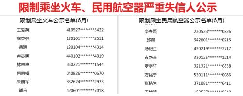 中新网客户端北京7月3日电(记者 李金磊)“一处失信,处处受限”。国家公共信用信息中心发布6月份新增失信联合惩戒对象公示,限制乘坐火车严重失信人123人,限制乘坐民用航空器严重失信人381人。