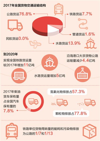 优化调整交通运输结构方面,在7月2日举行的国务院政策例行吹风会上,交通运输部有关负责人介绍,以推进大宗货物运输“公转铁、公转水”为主攻方向,通过三年集中攻坚,到2020年实现全国铁路货运量较2017年增加11亿吨、增长30%,水路货运量增加5亿吨、增长7.5%,沿海港口大宗货物公路运输量减少4.4亿吨。今年起,在全国范围实施铁路运能提升、水运系统升级、公路货运治理、多式联运提速、信息资源整合、城市绿色配送等六大行动。