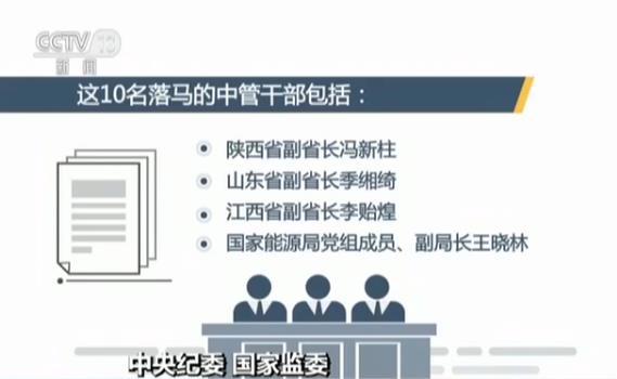 这10名落马的中管干部包括: 陕西省副省长冯新柱,山东省副省长季缃绮,江西省副省长李贻煌,国家能源局党组成员、副局长王晓林,贵州省委原常委、副省长王晓光,中国华融资产管理股份有限公司党委书记、董事长赖小民,内蒙古自治区政府副主席白向群,贵州省副省长蒲波,财政部原党组副书记、副部长张少春,中国船舶重工集团有限公司党组副书记、总经理孙波。