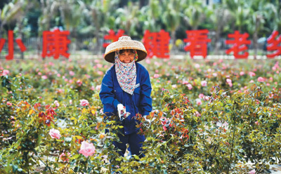 图为海南三亚亚龙湾玫瑰“斗笠大姐”李玉梅在园区内修剪玫瑰。