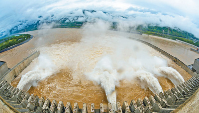 图为5日,江水通过三峡大坝泄洪深孔下泄。郑家裕摄(新华社发)