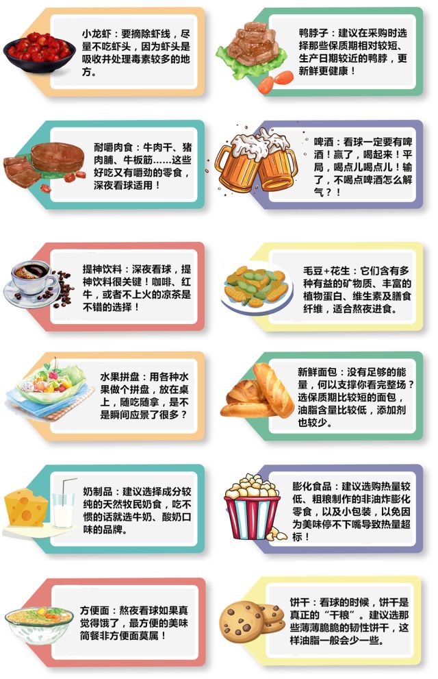 小编温馨提示:球队是别人家的,身体可是咱自己的,“爽了嘴伤了胃”,着实不划算。深夜看球,不仅要吃的美味,更要吃的健康!下面为吃货们送上一份健康饮食攻略图。
