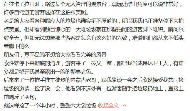 他在微博里写:“我发现我之前的想法是错的。我一直以为川藏垃圾多是因为垃圾桶太少,多放几个垃圾桶,游客有地方扔垃圾了,乱扔垃圾的现象自然就少了。这还是处于旅游风景区,没几百米就有一个垃圾箱,而且就在附近十米就有一个,但事实却如图所示。”