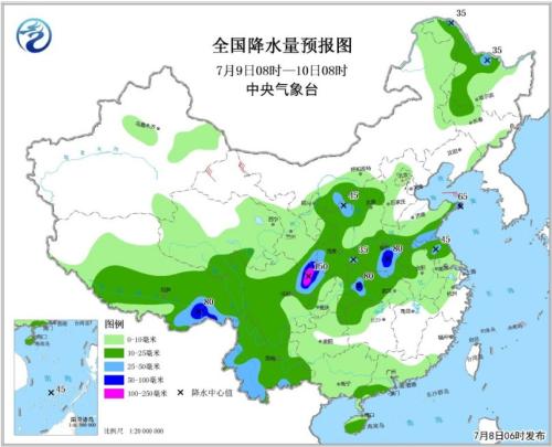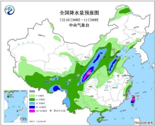 图2 全国降水量预报图(7月9日08时-10日08时)