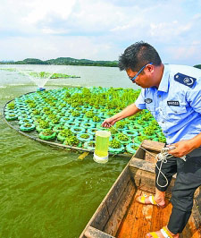 江西省新余市为保护仙女湖水质环境,通过查污纳管、直排截流、水生态保育等措施,不断完善污水管网系统和生态环境保护圈,做到应收尽收,应纳尽纳。图为该市分宜县环保局的工作人员在仙女湖入湖口取水,监测水质。周亮摄/光明图片