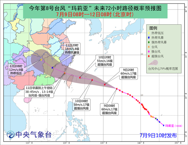大风预报:9日14时-10日14时,台湾东北洋面和东海南部的中东部海域的风力将逐渐加大到7-10级,部分海域风力可达11-12级;琉球群岛以东洋面将有9-12级大风,台风“玛莉亚”中心经过的附近洋面的风力有13-17级。