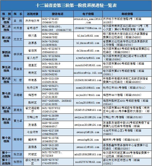 按照黑龙江省委统一部署和要求,十二届省委第三轮巡视共组建12个巡视组,第一阶段将对省司法厅、省人力资源和社会保障厅、省交通运输厅、省高级人民法院、齐齐哈尔市、牡丹江市、鸡西市梨树区、友谊县、嘉荫县开展常规巡视;对鸡西市、双鸭山市、七台河市、鹤岗市开展巡视“回头看”;对汤原县、桦川县、林甸县开展扶贫专项巡视;对哈尔滨市道里区、南岗区、阿城区,绥化市北林区开展房地产领域信访问题依法履职专项巡视。截至目前,省委12个巡视组已全部进驻第一阶段各被巡视单位。