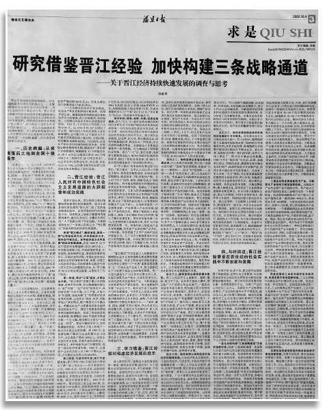 习近平同志撰写的《研究借鉴晋江经验 加快构建三条战略通道》一文,刊登于2002年10月4日出版的《福建日报》。