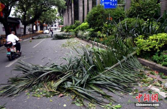 福州市区一路段路旁绿化带植物被被台风“玛莉亚”刮落一地。刘可耕 摄