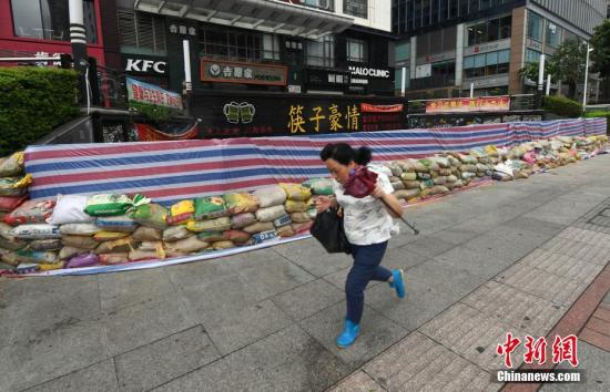 一名市民从市区五四路上一商家筑起的防御围墙前顶风前行。刘可耕 摄