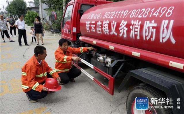 7月10日,霍州营村的村民义务消防员在检查消防车。