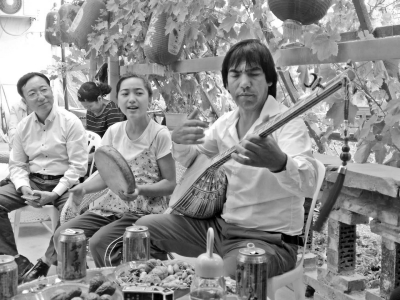 图为近日,和田县和谐新村村民吐地买买提父女二人,为上门家访的北京援疆干部弹唱一曲。