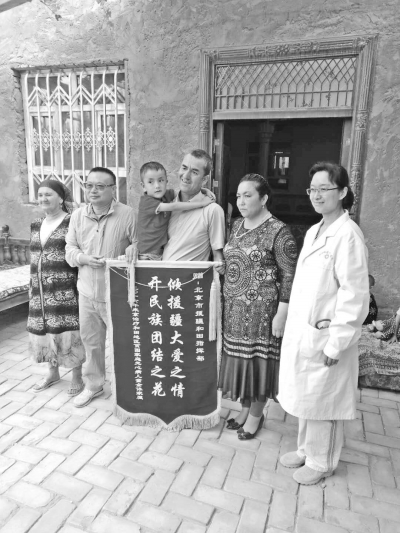 图为北京援疆医生登门看望和田县布扎克乡先心病儿童赴京救治后康复情况,收到当地维吾尔族群众送上的锦旗。本报记者余向东文/图
