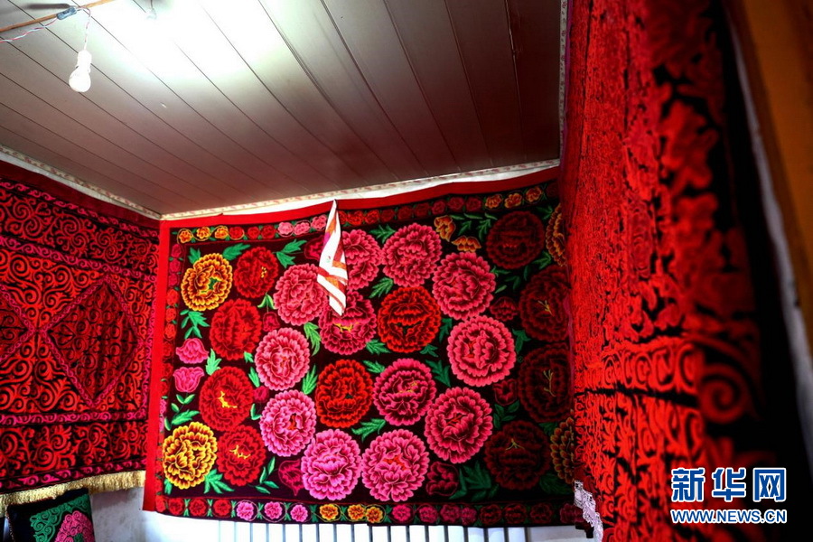 牧民家的手工刺绣挂毯。这样一幅手工刺绣可卖到1000元左右,增加了农牧民收入。武文霞 7月12日摄