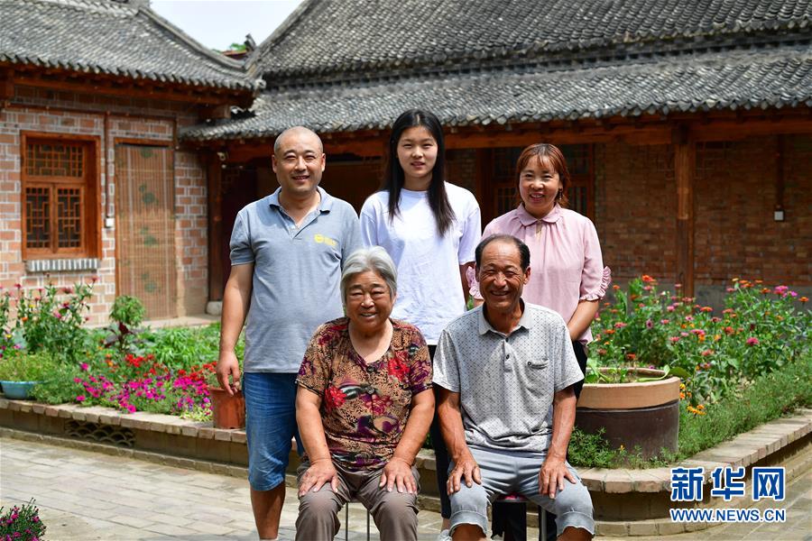 河南兰考张庄村村民游文超(前排右)一家三代人在小院内合影(6月21日摄)。 新华社记者 冯大鹏 摄